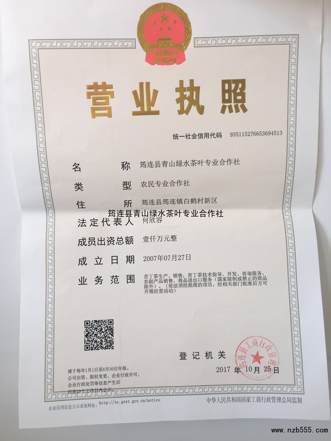 | 發(fā)證機(jī)構(gòu): | 筠連縣工商行政管理局 | 發(fā)證時(shí)間 : | 2017-10-25 |