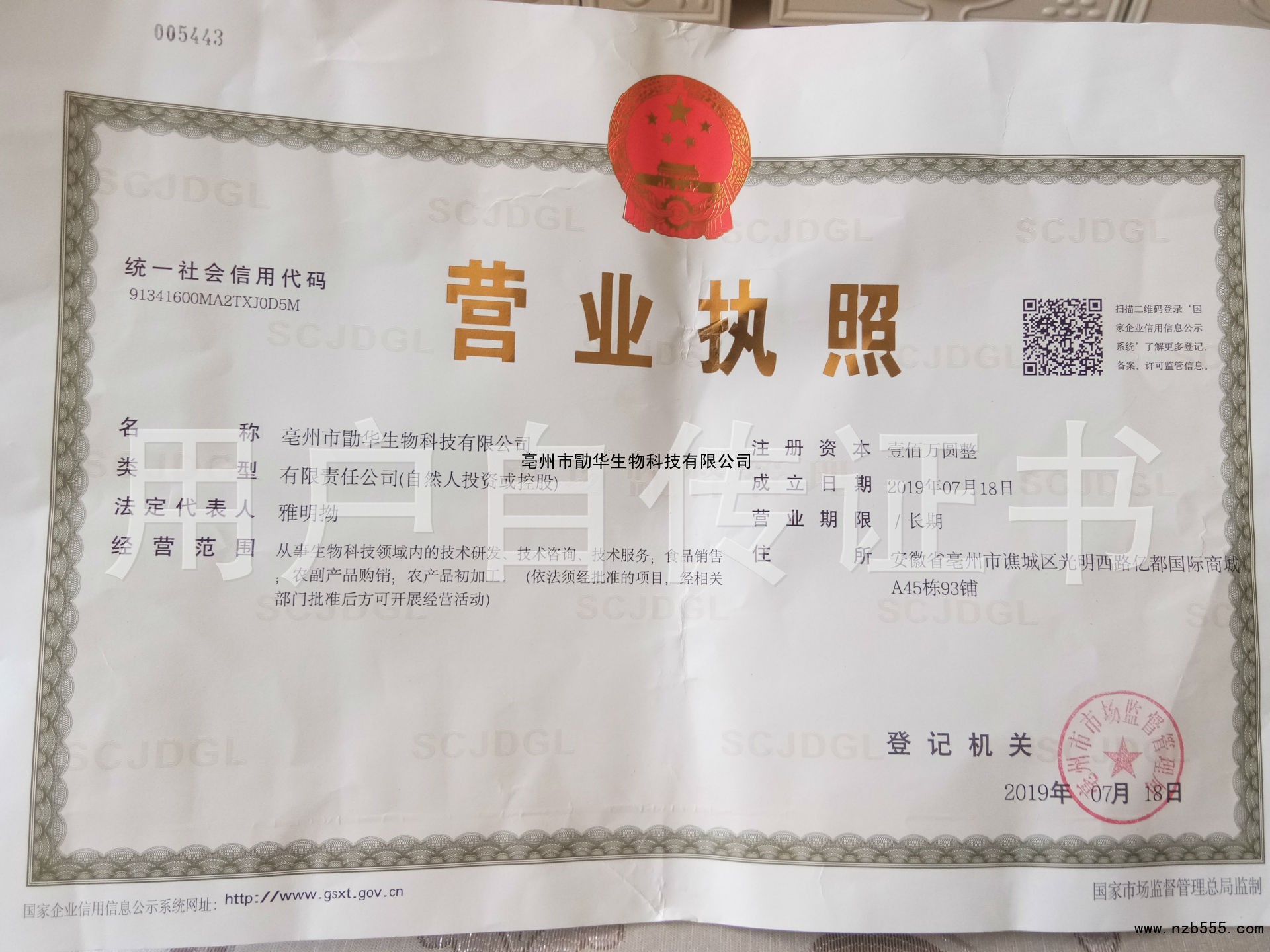 | 發(fā)證機(jī)構(gòu): | 毫州市市場(chǎng)監(jiān)督管理局 | 發(fā)證時(shí)間 : | 2019-07-18 |